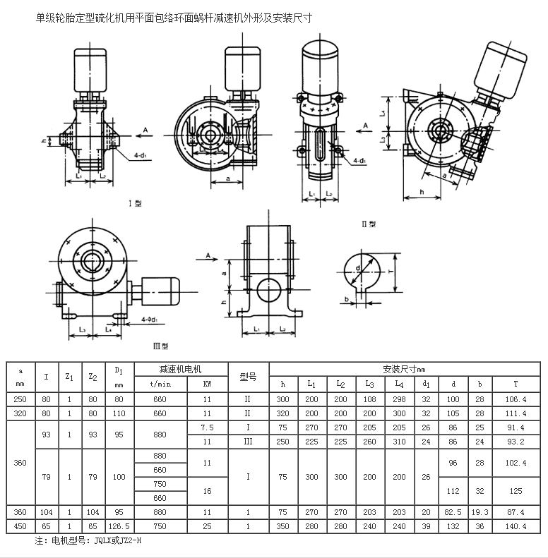 特征 環面蝸桿副具有承載能力大,傳動效率高,使用壽命長等特點,被廣泛應用于輪胎定型硫化機中。 適用范圍 本系列減速器適用于36in、40.5in、42in、46in、55in、63.5in、85in、100in等各種規格的輪胎硫化機。 系列 單級減速器中心距:265mm,320mm,360mm,380mm,450mm。 雙級減速器中心距:140mm/280mm,160mm/320mm。