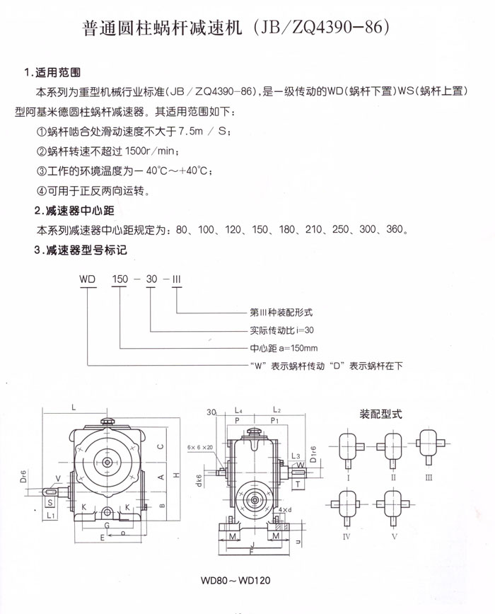 WD圓柱蝸桿減速機標準為一級傳動的阿基米德圓柱蝸桿減速器;WS(蝸桿上置)WD(蝸桿下置)。(蝸阿基米德圓柱蝸桿減速器適用于蝸桿嚙合處滑動速度不大于7.5m/s;蝸桿速度不超過1500r/min;工作環境溫度為-40~+40℃;并可正、反方向運轉的場合。